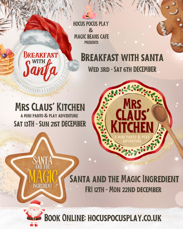 Join Hocus Pocus Play in Fairford for a choice of not one but THREE enchanting Christmas experiences, all with a foodie twist. Each experience includes plenty of time in their magical play village, interaction with various Christmas characters, a Christmas trail and a gift for all children over 6 months. Earlybird pricing ends October 31st.
